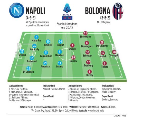 Il Napoli vola in attacco sulla destra con la staffetta Politano-Lozano: contro il Bologna toccherà al messicano dal primo minuto con l’ex interista pronto a subentrare a metà ripresa. Una formula che sta funzionando al meglio e che Spalletti sta portando avanti dall’inizio della stagione: un’unica eccezione alla regola contro il Genoa al Ferraris quando giocarono tutti e due insieme (Politano a destra e Lozano a sinistra) con Insigne falso nove nella partita in cui mancava Osimhen per squalifica.