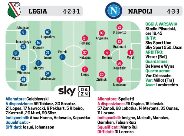 Questa sera alla “Pepsi Arena” di Varsavia, i padroni di casa del Legia, cercheranno il riscatto in Europa League e conservare il primo posto in classifica. I polacchi giocheranno a specchio come modulo, più o meno con lo stesso 11 sceso al “Maradona”, Luquinas in vantaggio su Kastrati. Per il Napoli diverse le assenze soprattutto: Fabian Ruiz, Insigne e Osimhen, oltre allo squalificato Mario Rui. In porta Meret, a sinistra Juan Jesus. Le novità sono in attacco con Elmas e Petagna in vantaggio su Lozano e Mertens, Infine Demme sarà il sostituto di Fabian Ruiz.