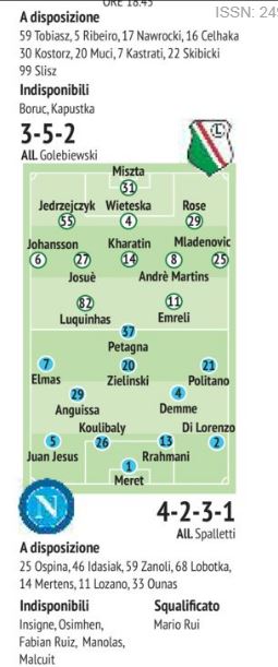 [Grafico] – Legia/Napoli: “Il Mattino” dà le sue formazioni