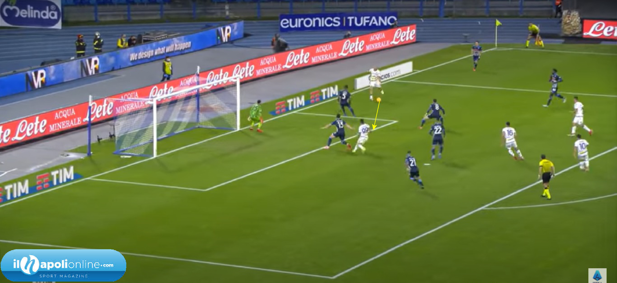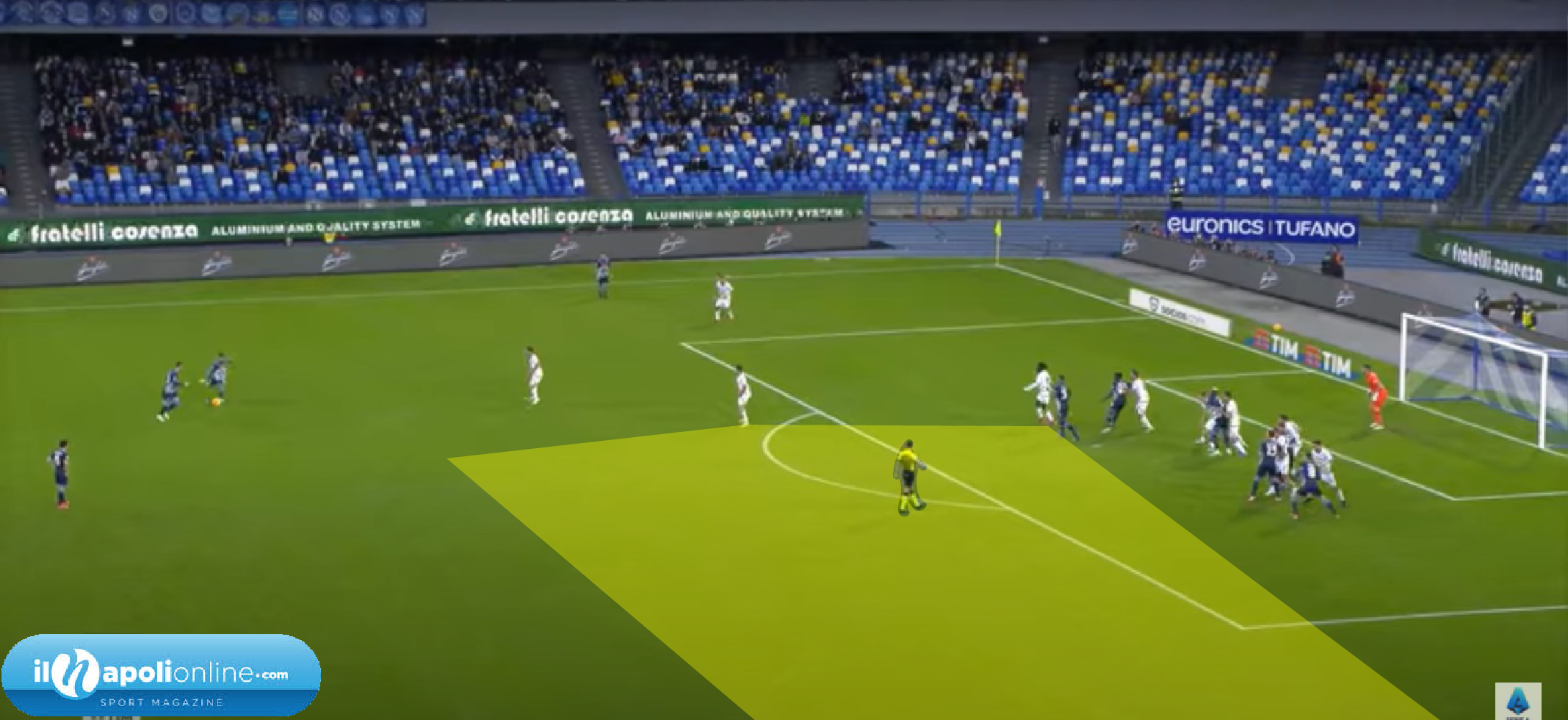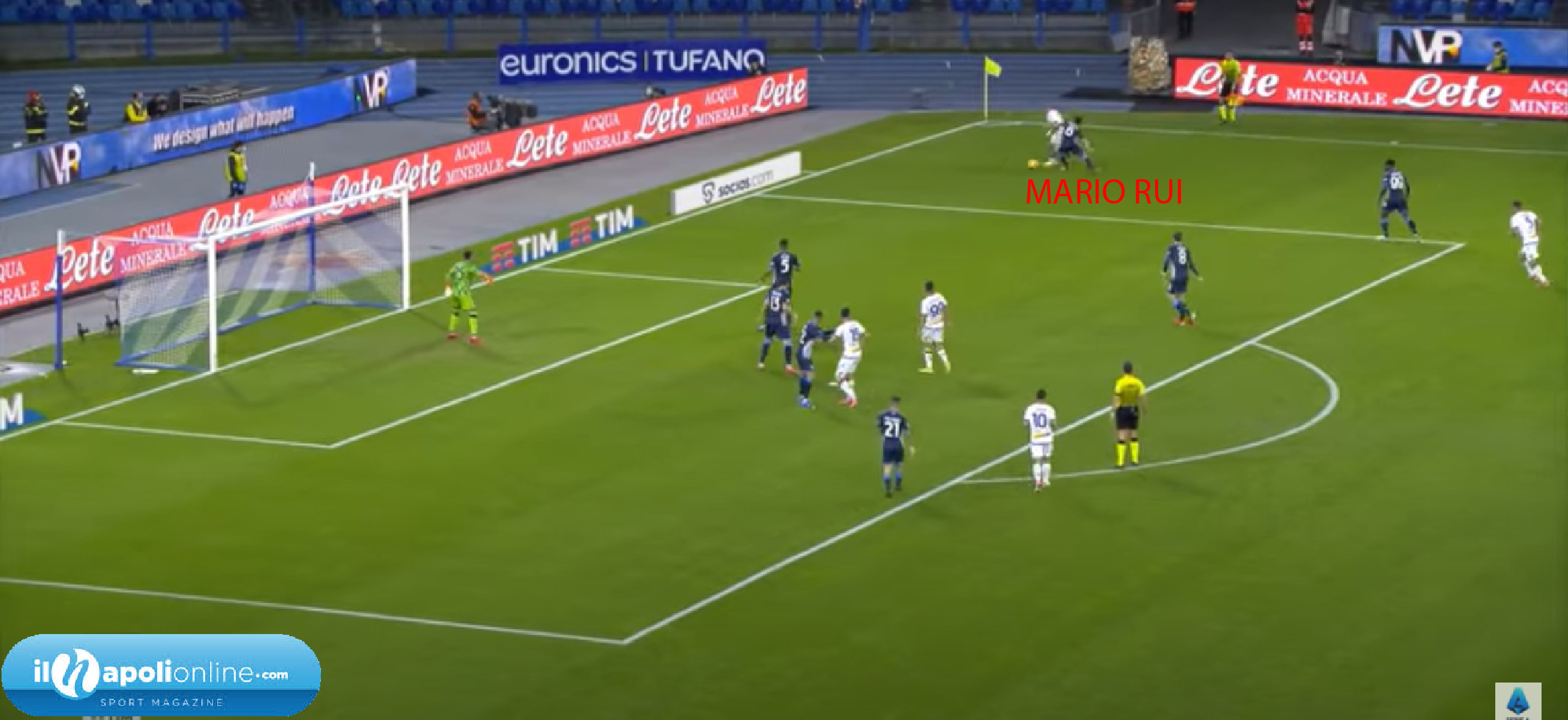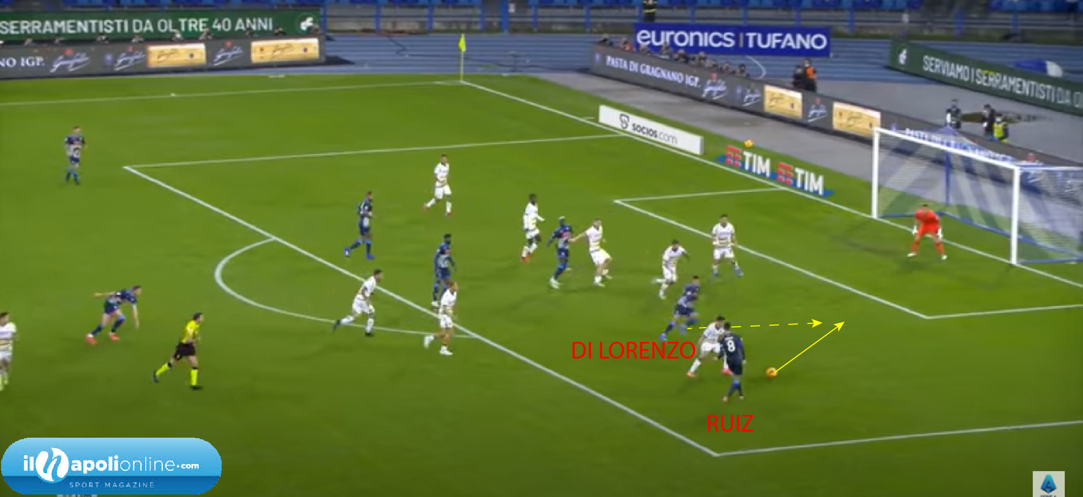 Ottima azione individuale dell’avversario che supera Mario Rui, che ha qualche colpa (figura 1); infatti il terzino invece di temporeggiare ed aspettare l’avversario prova ad affrontarlo in maniera “piatta”. Ovvero con una postura errata, in quanto invece di aspettarlo in diagonale per portarlo ancora di più verso l’esterno lo ha affrontato di faccia. L’altro errore invece di Rrahmani è il “non vede e non sente” l’avversario. E’ girato con faccia alla porta, altro errore in quanto con un rimbalzo potrebbe fare autorete, inoltre non vede l’avversario dove si posizione, e non lo sente in quanto non lo marca stretto, come dovrebbe fare in area di rigore.