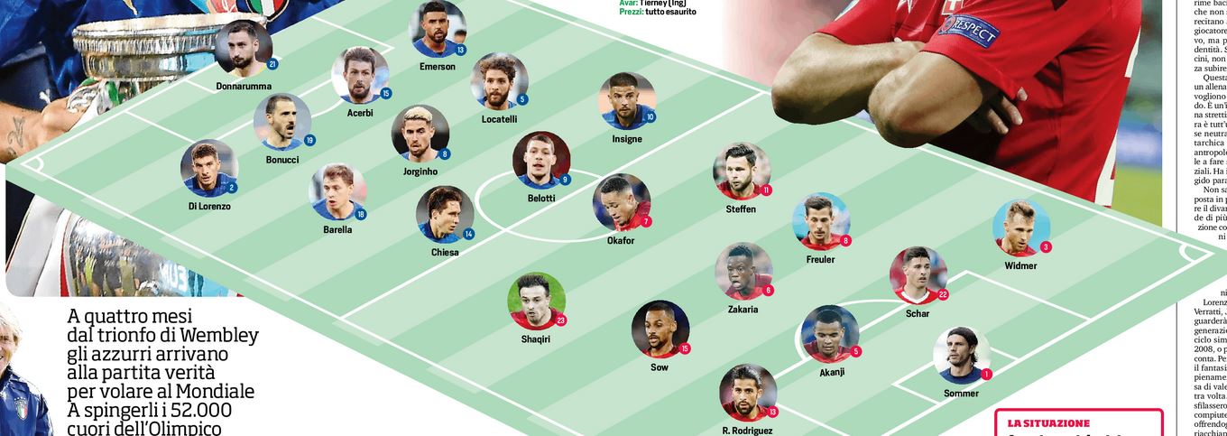 Questa sera allo stadio Olimpico, fischio d’inizio ore 20,45, l’Italia affronterà la Svizzera, con l’obiettivo dei tre punti e avvicinarsi in maniera netta alla qualificazione ai prossimi mondiali in Qatar. In difesa la coppia sarà composta da Bonucci e Acerbi. Di Lorenzo a destra ed Emerson a sinistra. A centrocampo recupera Barella, con Jorginho e Locatelli che completano la mediana. In attacco infine sarà Belotti che prenderà il posto di Immobile, con Chiesa a destra e Insigne aa sinistra. In casa elvetica ben 7 assenze dove il giocatore chiave sarà Shaquirì.