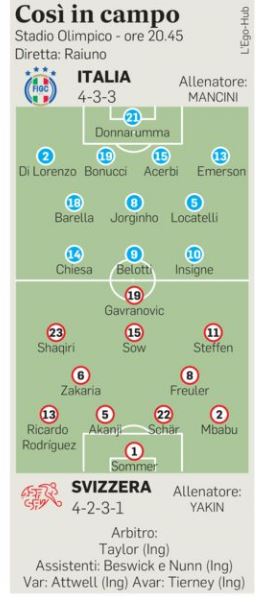 formazione. E cioè. Ma stasera, contro la Svizzera, chi gioca? O meglio: chi gioca in attacco? Considerando le assenze di Chiellini, Pellegrini, Zaniolo, Verratti e soprattutto di Immobile, molte scelte sono chiare, tante inevitabili, poche avvolte nel dubbio. Davanti a Donnarumma si allargheranno a ventaglio Di Lorenzo, capitan Bonucci, il laziale Acerbi e l’ex romanista Emerson. A danzare (o, all’occorrenza, a duellare) in mezzo al campo verosimilmente saranno il recuperato Barella, Jorginho e Locatelli. E poi. E poi c’è l’attacco e qui decollano le perplessità. Secondo quanto filtrava nella serata di ieri, a sostituire Immobile e quindi a trascinare la Nazionale dovrebbe essere Belotti. Da centravanti vero. Ha spiegato Mancini: «Il Gallo ha chance di giocare.Non sarà al cento per cento perché viene da un infortunio e magari non ha i 90 minuti. Se riuscisse a fare gol nei primi 60 sarebbe meglio…».