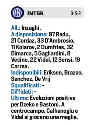 Domenica sera alle ore 18,00, allo stadio “Meazza”, si giocherà lo scontro al vertice tra l’Inter e il Napoli, valevole per la tredicesima giornata. Per il tecnico dei nerazzurri due i dubbi da sciogliere per la gara contro gli azzurri. In difesa Ranocchia o Dimarco, al posto dell’infortunato De Vrij. A centrocampo Calhanoglu dovrebbe spuntarla su Vidal. In attacco spazio a Dzeko-Lautaro Martinez, con Correa pronto in caso di evenienza. Per Spalletti invece scelte già fatte in vista del match contro l’Inter. Zielinski favorito su Elmas, mentre Politano è in netto vantaggio su Lozano. Infine tornerà dalla squalifica in difesa Koulibaly al fianco di Rrahamani, con il pieno recupero di Malcuit e Manolas.