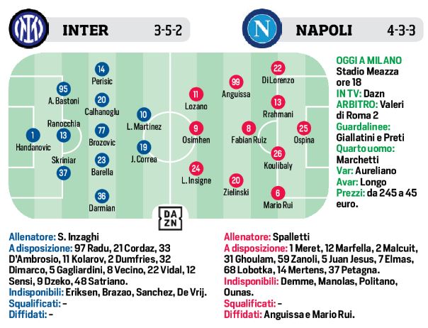 Questo pomeriggio allo stadio “G. Meazza”, si giocherà il big-match per il vertice tra l‘Inter e il Napoli. I nerazzurri hanno l’occasione di accorciare dal duo di testa, gli azzurri hanno la certezza del primo posto, dopo la sconfitta del Milan. Simone Inzaghi ha scelto il duo d’attacco, si tratta del duo argentino: Correa-Lautaro Martinez, con Dzeko che partirà dalla panchina. Per il resto in difesa Ranocchia al posto di De Vrij. Per Spalletti, in attesa del nuovo risultato dei tamponi, ha fatto le sue scelte, con un centrocampo a 3 per contrastare la mediana dell‘Inter.