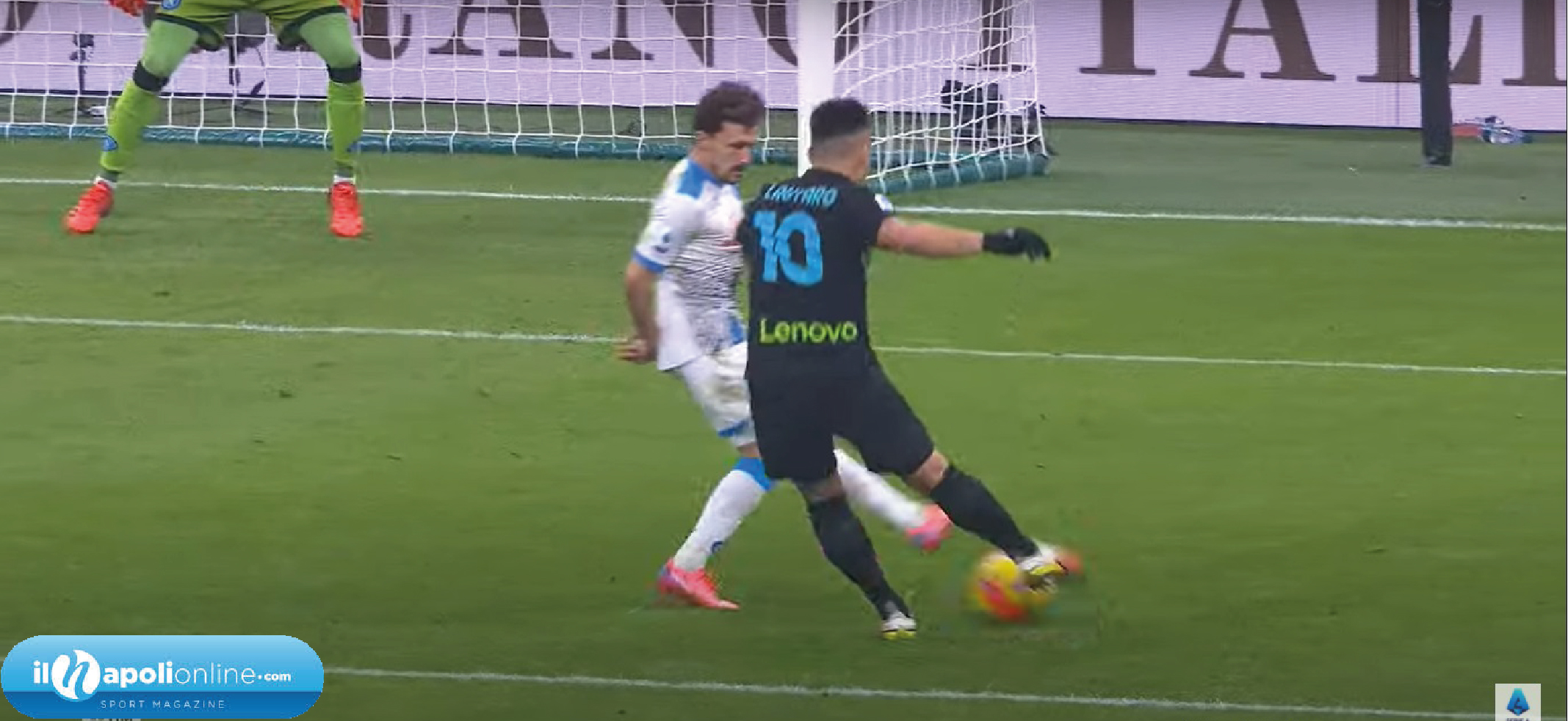 Ecco l’azione che porta al pareggio i nerazzurri, cross dal fondo che incrocia l’area di rigore; con il centrocampo e gli esterni di attacco che sono in netto ritardo nella fase difensiva (figura 1). Con Mario Rui che stringe molto quando poteva star qualche metro dietro, ma non avrebbe risolto molto. In quanto poi l’avversario ha appoggiato palla al centrale in appoggio. Che tirando colpisce la mano di Koulibaly, ed è rigore netto. Se il braccio sinistro di Koulibaly fosse stato più verticale e non lo avesse allargato; così facendo ha aumentato il volume del suo corpo, magari il VAR non avrebbe richiamato l’arbitro.