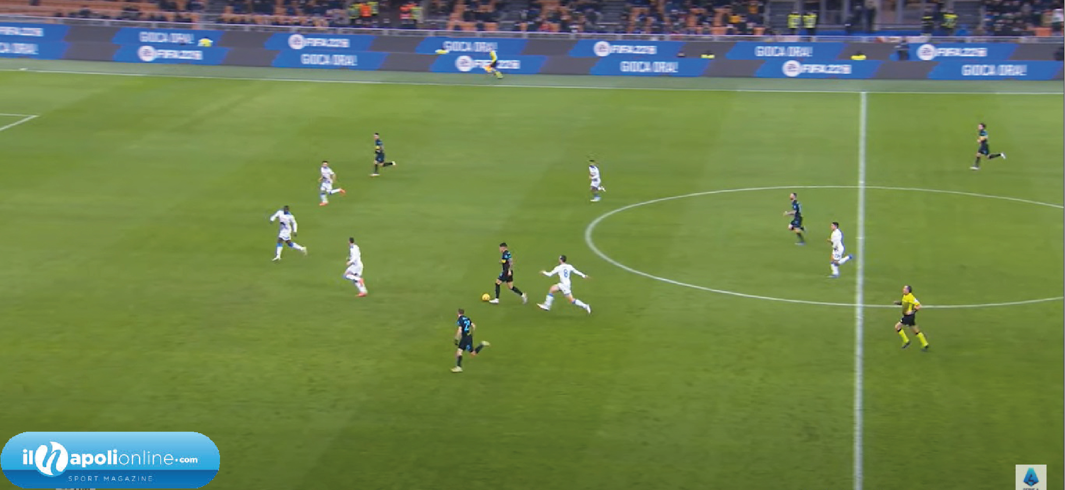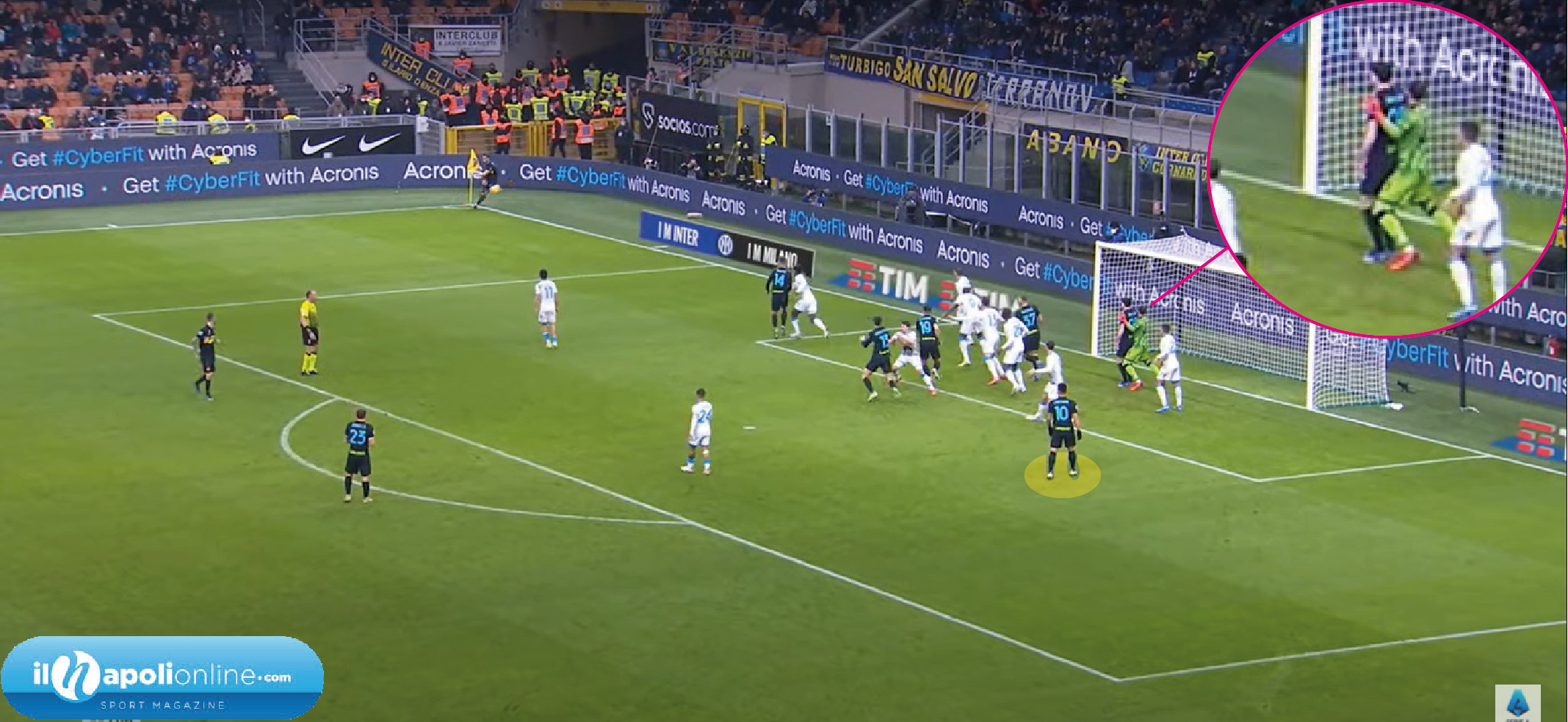 Il vantaggio dell’Inter arriva da un calcio d’angolo; infatti si vede il movimento di Perisic che taglia davanti al primo palo. Seguito da Anguissa lo lascia andare gli ultimi metri; questo movimento dovrebbe richiamare all’attenzione gli azzurri, infatti fa muovere sia Osimhen che Zielinski che sono a copertura del primo palo. Due cose attirano l’attenzione, la marcatura a zona sui calci piazzati ha funzionato poco (figura 2); lasciando molti uomini soli e privi di marcatura. In aggiunta poteva esserci fallo su Ospina, quando l’avversario gli si pone davanti impedendogli qualsiasi movimento (figura 2, ingradimento); ma che solo il VAR avrebbe potuto vedere questo tipo di fallo, che non viene fischiato mai in Serie A. L’altro appunto che Zielinski invece di andare incontro alla palla per colpire di testa; tende ad aspettarla ed a prenderla bassa di testa per poterla rinviare (figura 3); cosa non accaduta in quanto viene anticipato dall’avversario.