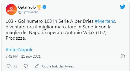 Secondo i dati di Opta Italia, quella di questa sera è la rete numero 103 in Serie A per l’attaccante belga, diventato ora il miglior marcatore in Serie A con la maglia del Napoli. Dries ha superato nella speciale classifica Antonio Vojak (102 gol).