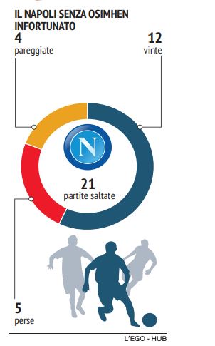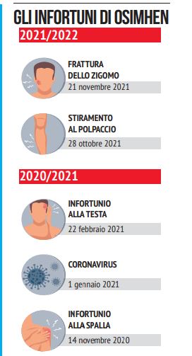 La spalla, il coronavirus, poi il trauma cranico e lo stiramento al polpaccio, ora l’intervento chirurgico per la frattura dello zigomo. Un anno e mezzo di Napoli interrotti da infortuni di ogni tipo, frammentari, dove le qualità sono state spezzate di volta in volta da qualche incidente. 21 partite saltate (senza di lui 5 sconfitte, 4 pareggi e 12 vittorie), poi tanti spezzoni. Ora 60-90 giorni di stop attendono Osimhen pure questa volta.Inutile fare corse contro il tempo, inutile pensare che sarà una cosa passeggera. Non lo è. Rischia di saltare anche la Coppa d’Africa, c’è poco da fare.