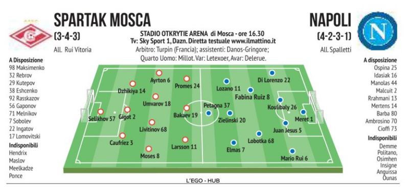partita di esordio contro il Leicester e poi le ha giocate tutte. Juan Jesus l’unica novità in difesa rispetto al “Meazza”. In panchina Manolas che torna a disposizione dopo l’infortunio muscolare che accusò nel finale del match di Europa League del 21 ottobre contro il Legia Varsavia al “Maradona”. In panchina anche Malcuit, che è tornato già tra i convocati contro l’Inter, e dovrebbe giocare quasi certamente uno spezzone di partita. A centrocampo torna dal primo minuto Lobotka che rientrò contro il Legia a Varsavia giocando gli ultimi 25 minuti a buon livello. Esterno sinistro Elmas che verrà schierato al posto di Insigne. Da centravanti favorito Petagna con Mertens che Spalletti ha intenzione di utilizzare come carta a partita in corso. In panchina tre giovani della “Primavera”: il difensore Barba, il centrocampista Cioffi e l’attaccante Ambrosino. Napoli in “bolla” in Russia per evitare al massimo i pericoli legati ai contagi per il Covid: per questo motivo la conferenza stampa del Napoli ieri si è tenuta a Castel Volturno (con l’autorizzazione dell’Uefa) dove il Napoli si è allenato non svolgendo la rifinitura in Russia. Gli azzurri sono partiti all’ora di pranzo da Capodichino raggiungendo l’hotel a Mosca per il ritiro dove resteranno fino allo spostamento di oggi allo stadio per la partita. R. Ventre (Il Mattino)