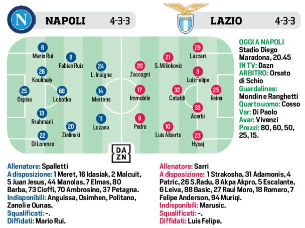 Questa sera alle ore 20,45, presso lo stadio “Maradona”, si giocherà il big-match tra il Napoli e la Lazio, con l’obiettivo di riscattare le sconfitte dello scorso turno di campionato. Spalletti aveva un dubbio a centrocampo, alla fine giocherà Lobotka al posto di Elmas, per dare più equilibrio in mezzo al campo. In avanti rientro di Insigne che affiancherà Mertens e Lozano. In casa biancoceleste l’ex Sarri punterà a sorpresa in attacco Zaccagni al posto di Felipe Anderson. Per il resto tornerà tra i pali Reina dopo il turno di riposo a Mosca.