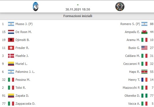 Ecco le formazioni ufficiali della quindicesima giornata di Serie A; la partita delle 18.30 Atalanta-Venezia, che si giocherà al Gewiss Stadium di Bergamo.