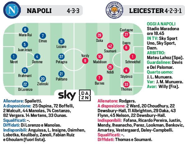 Questo pomeriggio allo stadio “Maradona”, fischio d’inizio ore 18,45, il Napoli affronterà il Lieicester, per l’ultima giornata del girone C di Europa League. Per gli azzurri serve il successo e sperare che lo Spartak Mosca non vinca a Varsavia contro il Legia. E’ piena emergenza per la squadra di Spalletti, dove Petagna giocherà in avanti, ai lati Politano e Lozano. Per il resto sarà difesa a 4 e Meret per la porta. Per i “foxes” invece è emergenza Covid, sette giocatori positivi più tre dello staff di Rodgers. Daka, Maddison e Barnes alle spalle di Vardy,