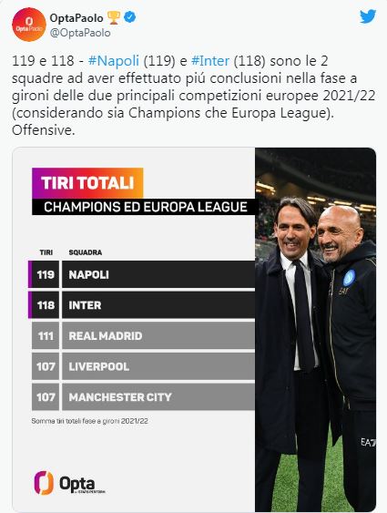 119 conclusioni offensive verso la porta avversaria, quasi 20 per partita di media. Sono i numeri impressionanti del Napoli di Luciano Spalletti, pubblicati da Opta Italia al termine della prima fase di stagione europea con la conclusione dei gironi di Champions e Europa League. Gli azzurri sono la squadra che hanno tirato di più in queste sei partite giocate, di un pelo davanti a un’altra squadra italiana come l’Inter, che si ferma a 118.Le due squadre italiane vanno a braccetto e mettono il naso davanti ai grandi top club del continente.