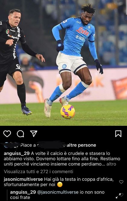 La sconfitta del Napoli contro lo Spezia sta facendo discutere molto i tifosi in queste ore. Il tonfo degli azzurri prima di Natale proprio non è andato giù a tanti e di mezzo ci è finito anche Zambo Anguissa, centrocampista azzurro che ora lascerà Napoli per raggiungere il Camerun e la Coppa d’AfricaDopo le parole di Anguissa – «A volte il calcio è crudele, ma dobbiamo continuare a lottare fino alla fine» ha scritto l’azzurro ai tifosi – un tifoso gli ha risposto via social «Hai già la testa in Coppa d’Africa sfortunatamente per noi»,