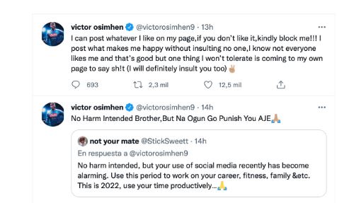 La risposta dello stesso Osimhen non si è fatta attendere. «Posso postare quello che mi piace sulla mia pagina, se non ti piace bloccami gentilmente» – la replica della punta del Napoli – «Pubblico ciò che mi rende felice senza insultare nessuno, so che non piaccio a tutti e questo è un bene, ma una cosa che non tollero è venire sulla mia pagina per dire stron***».