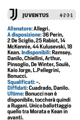 Come dice un noto proverbio, se Roma piange, anche Sparta non ride. Il Napoli avrà diverse assenze, anche se si auspica che qualche recupero possa esserci per i tamponi, ma anche in casa bianconera non c’è da essere ottimisti. Out causa Covid Chiellini, Arthur e Pinsoglio, mentre sono in dubbio in tre: Pellegrini e Kajo Jorge per stato influenzale, così come Bonucci. Il difensore centrale ha un affaticamento muscolare, quindi in dubbio, pronto Rugani. In attacco ballottaggio Morata-Kean. Per Spalletti potrebbe esserci un gradito ritorno, sempre che il tampone di Malcuit non si negativizzi. Ghoulam pronto al posto da titolare sulla sinistra. In attacco Mertens avanti su Petagna, alle sue spalle: Politano, Zielinski e Insigne.