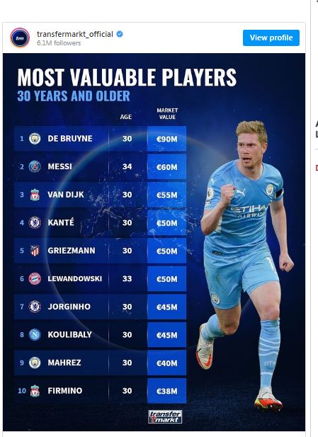 Guida la classifica il sempreverde De Bruyne (90 milioni), davanti a Messi (60) e van Dijk (55). Fonte: mattino.it