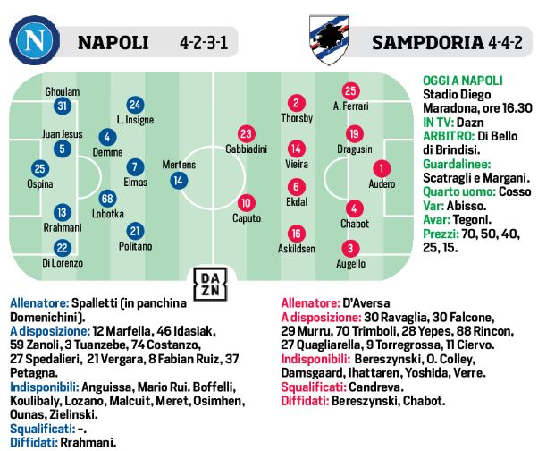 (Formazioni) Napoli/Sampdoria, Domenichini ha scelto il sostituto di Piotr. Difesa inedita per D’Aversa
