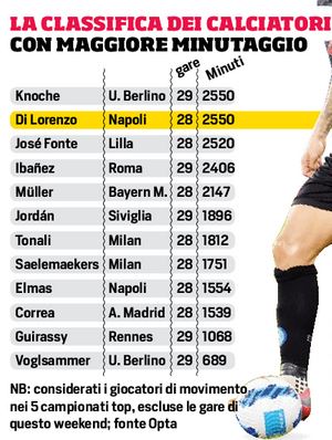 All’alba di questo weekend di calcio, appena cominciato, Di Lorenzo era al primo posto in Europa – nei cinque principali campionati – per minuti giocati: 2550 in 28 partite, gli stessi del tedesco Knoche, difensore dell’Union Berlino, in campo ieri per altri 90′ e dunque al momento primo da solo in attesa della partita di domani. In questa speciale classifica, dove Ibanez della Roma è al quarto posto, trova spazio anche Elmas, sempre in campo (28 presenze, come Di Lorenzo) ma per un totale di 1554 minuti. È questa la grande differenza tra Di Lorenzo e gli altri: lui gioca sempre e le gioca tutte, fino alla fine, e raramente accusa stanchezza. Per abitudine ha smesso di guardare la lavagnetta perché il suo numero, al momento dei cambi, non compare mai.