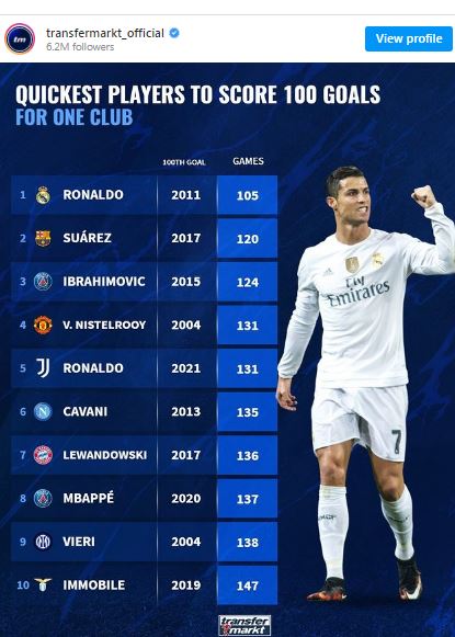 Quali sono gli attaccanti più veloci ad aver segnato 100 gol con la stessa maglia di club? Questa la risposta che arriva dall’ultimo studio di Transfermarkt, che incorona la vena realizzativa di Cristiano Ronaldo: il portoghese, infatti, ha raggionto la “tripla” cifra con la maglia del Real Madrid nel 2011 in sole 105 partite giocate. 120 erano state le partite necessarie a Suarez nel Barcellona, 124 invece quelle di Zlatan Ibrahimovic con la maglia del Paris Saint Germain nella stagione 2015.