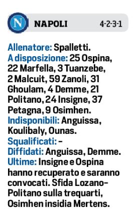 Domenica allo stadio “Maradona”, fischio d’inizio alle ore 15,00, si dovrebbe giocare il derby campano tra il Napoli e la Salernitana. I nove casi di positività in casa granata, al momento mettono in forte dubbio il match contro gli azzurri. In casa partenopea arrivano buone notizie dall’infermeria, Insigne si è allenato con il gruppo, Ospina in parte nella giornata di ieri. Per il resto l’unico ballottaggio della vigilia è Lozano-Politano a destra. Per gli ospiti oggi è giornata decisiva con il giro di tamponi, con l’auspicio che qualcuno si negativizzi, mentre è in dubbio la presenza di Ribery, ancora che si allena a parte.