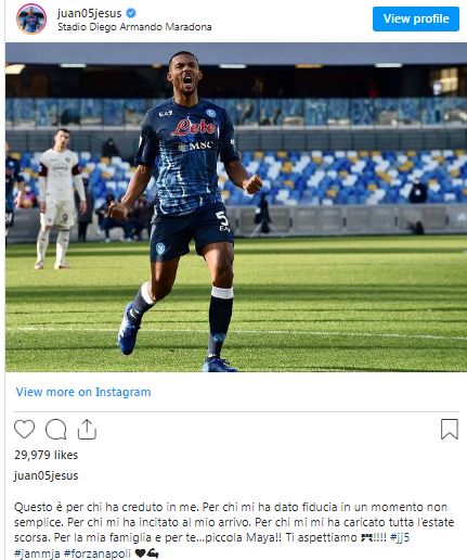 «Questo è per chi ha creduto in me. Per chi mi ha dato fiducia in un momento non semplice». con queste parole Juan Jesus esulta sui social, il difensore del Napoli oggi ha trovato finalmente il gol (dopo due annullati in campionato), la rete che ha messo in discesa la partita contro la Salernitana.
