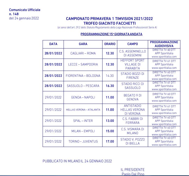 UFFICIALE PRIMAVERA 1 – Data e orario di Genoa-Napoli