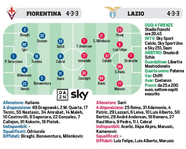 Serie A – Ore 20,45: Fiorentina/Lazio. Così in campo questa sera