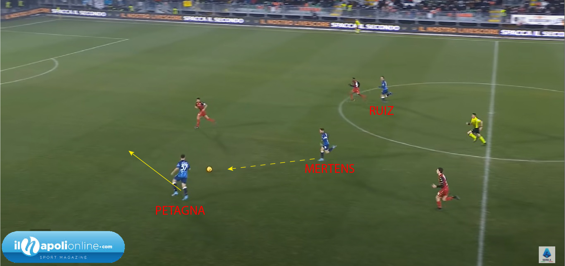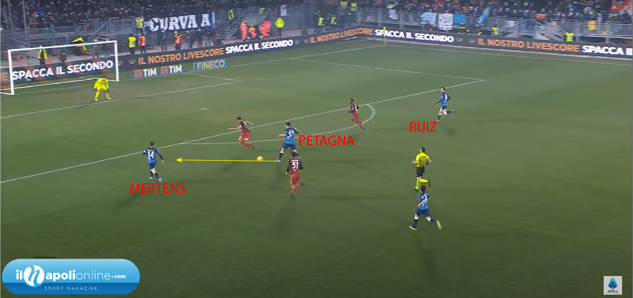 Secondo goal che arriva in contropiede a partita ormai finita, Mertens passa subito palla a Petagna (figura 3), e si sovrappone a lui. In un 3 contro 2 difensori, i difendenti possono solo indietreggiare fino al limite dell’area dove dovranno scegliere come contrastare gli avversari. Ma nel portare palla Petagna ha due chance di passaggi; ovvero a destra lo segue Ruiz; mentre a sinistra c’è la sovrapposizione di Mertens. L’attaccante azzurro, decide di premiare “Ciro” Mertens (figura 4), ma il tiro non è dei migliori; nè tantomeno la respinta del portiere (figura 5) avversario il quale permette al “gigante buono“, Petagna, di insaccare e festeggiare.