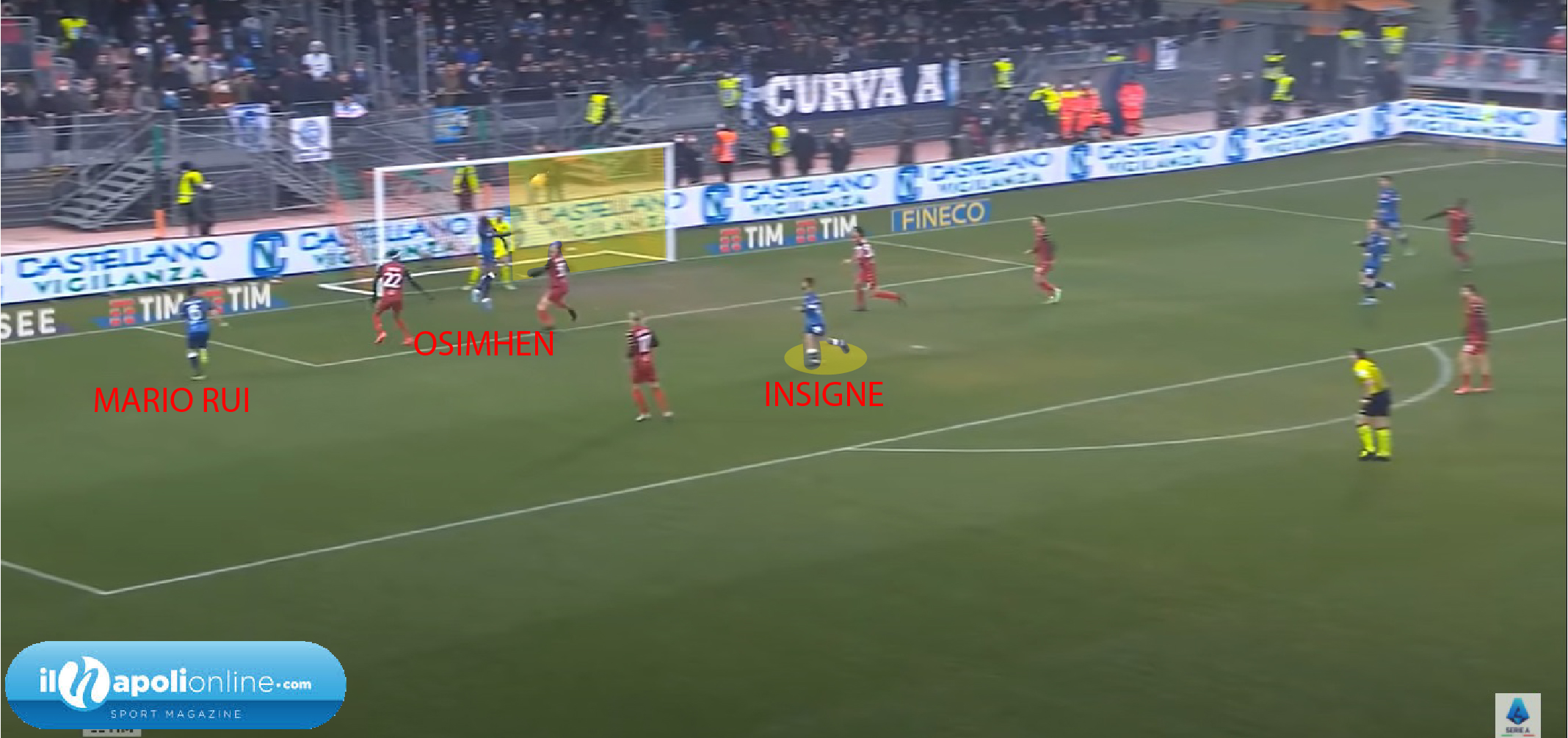 Analizzando quelli che sono gli aspetti studiati sulla partita si vede (figura 1), la posizione insolita di Insigne; il quale sappiamo che di testa non è il migliore, ma è lì al centro area; così facendo permette a Mario Rui di alzarsi per offendere. E’ proprio la posizione di Insigne che “rompe” la difesa del Venezia, in quanto il marcatore di Osimhen, si trova in difficoltà su chi dei due prendere. La scelta di Politano di mettere palla lì sul secondo palo è studiata proprio dalla posizione di Insigne; infatti c’era anche la possibilità che il cross se fosse più esterno ci fosse stato Mario Rui. Il movimento di Insigne (figura 2), fa capire quanto sia stato determinante lui con quella posizione, infatti non ci prova minimamente ad andare a colpire di testa; bensì resta in posizione aspettando l’eventuale seconda palla.