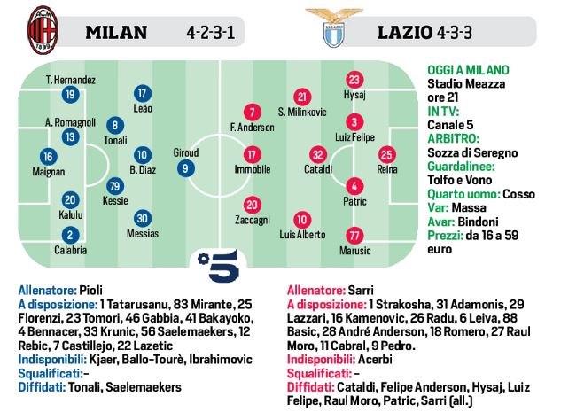 questa sera tocca al Milan e alla Lazio, così probabilmente in campo