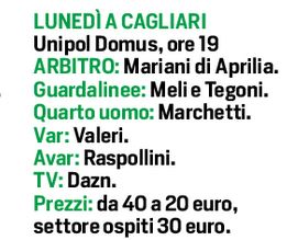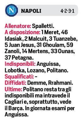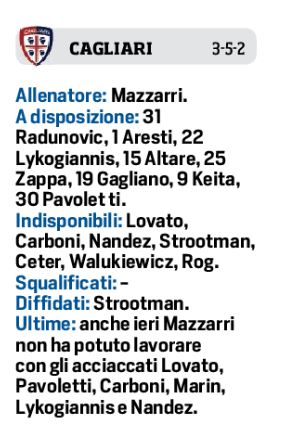 Lunedì sera all’ “Unipol Stadium”, fischio d’inizio alle ore 19,00, si giocherà il match tra il Cagliari e il Napoli, classico testa-coda. Per l’ex Mazzarri, il modulo sarà il classico 3-5-2, dove l’auspicio è recuperare Pavoletti, almeno per la panchina, come per Lykogiannis. Al fianco di Joao Pedro giocherà Gaston Pereiro. In difesa recupero dell’infortunato Obert. Per Spalletti, invece, oggi saprà il responso su Anguissa. Per il resto forse una flebile speranza per Politano, pronto per il Barcellona altrimenti. Ritorno per Ospina in porta e Mario Rui a sinistra. Ballottaggio Ounas-Elmas a destra.