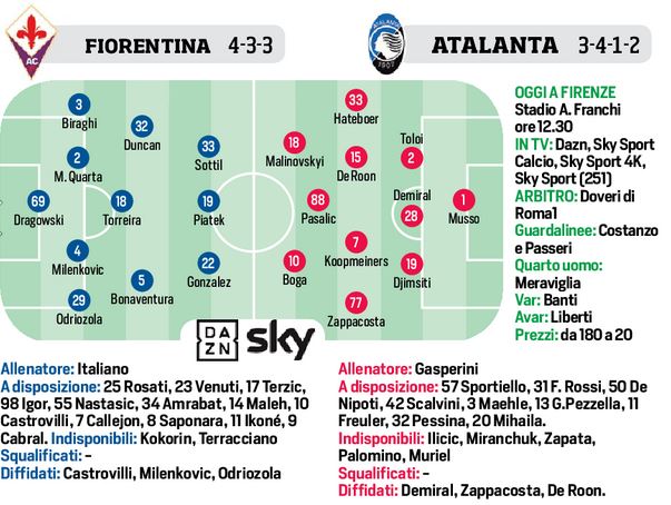 Fiorentina-Atalanta, i riflettori del Napoli su questa gara. Ecco secondo il CorrSport come potrebbreo scendere in campo: