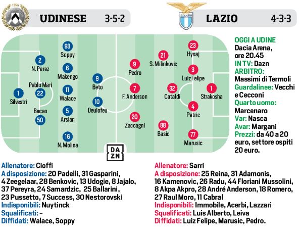 Serie A – La Lazio alla ricerca di un posto in Europa, l’Udinese per la tranquillità. Ecco le formazioni del CdS: