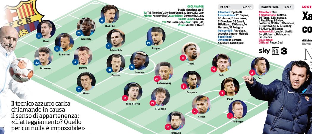 Questa sera allo stadio “Maradona”, fischio d’inizio alle ore 21,00, il Napoli affronterà il Barcellona per il return-match degli spareggi di Europa League. Per mister Luciano Spalletti due i dubbi da sciogliere. Mario Rui o Juan Jesus per il ruolo di terzino sinistro, con il portoghese in leggero vantaggio. L’altro ballottaggio Elmas-Ounas come esterno destro, il macedone parte favorito. Per il resto recuperati Di Lorenzo, Politano e Insigne. In casa degli spagnoli in difesa c’è il ritorno di Araujo. Dest favorito di Mingueza, mentre in avanti ballottaggio Ferran Torres-Gavi con l’ex City in leggero vantaggio. In attacco infine Adama Trorè e Aubameyang.