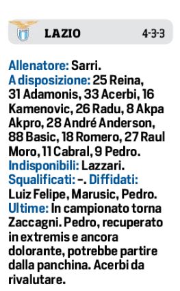 Il Napoli, dopo la netta sconfitta contro il Barcellona, inizierà a pensare alla sfida in campionato contro la Lazio, per conservare la zona Champions. Anche i biancocelesti punteranno al riscatto dopo l’eliminazione contro il Porto. Per i ragazzi di Sarri, mancherà solo Lazzari, al suo posto l’ex Hysaj e Marusic a sinistra. Per il resto andranno valutati Acerbi e Pedro dal punto di vista fisico. Rientrerà Zaccagni, al suo fianco Immobile e Felipe Anderson. In casa azzurra, quasi lo stesso 11 visto contro gli spagnoli, con Politano pronto all’evenienza a destra. Rientro di Ospina dal primo minuto al posto di Meret.