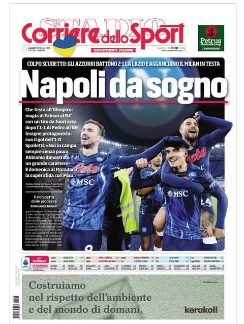 NewsCalcioIn Evidenza Cds Campania – “UN NAPOLI DA SOGNO”. Spalletti: “Potevamo chiuderla prima!” By Giuseppe Sacco il Feb 28, 2022 - 07:30:02 0 Condividi In prima pagina e nel profilo interno del Cds edizione della Campania Factory della Comunicazione CalcioCampaniaNapoliPagina 0 Condividi FacebookTwitterGoogle+ReddItWhatsAppPinterestE-mail
