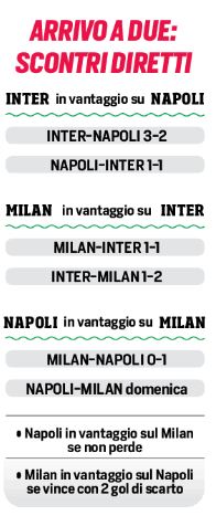 Quello di un arrivo di due squadre alla pari è lo scenario più semplice da decifrare: tra Milan e Inter farebbe festa Pioli, tra Inter e Napoli riderebbe Inzaghi, tra Napoli e Milan per ora la spunterebbe Spalletti. Nell’ipotesi di una vittoria di misura dei rossoneri, invece, il Napoli potrebbe contare comunque su cinque gol di vantaggio in termini di differenza reti generale: oggi è +30 e andrebbe a +29, mentre il Milan salirebbe da +24 a +25.