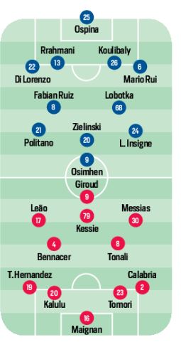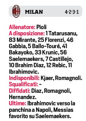 Oggi è giorno di vigilia per il tanto atteso big-match tra il Napoli e il Milan, gli allenatori Spalletti e Pioli dovranno sciogliere le riserve. In casa partenopea ad esempio ritornerà dal primo minuto a centrocampo Lobotka, dopo i minuti finali contro la Lazio, affiancherà Fabian Ruiz. Per il resto solo un dubbio da sciogliere tra Elmas e Politano, mentre sarà la stessa formazione che ha vinto all’Olimpico. Per i rossoneri, out Romagnoli, anche ieri allenamento in palestra. Per Ibrahimovic invece flebile speranza per portarlo in panchina. Infine Junior Messias parte favorito rispetto a Saelemakers sul lato destro e Kessie nel ruolo di trequartista.