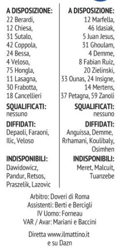 merita di giocare nel posto dove ha mostrato di dare il meglio di sé, ovvero sottopunta alle spalle di Osimhen. Insomma, a Verona ci si attende una mini-rivoluzione in attacco rispetto al Milan: con il ritorno di Lozano titolare, proprio al posto del capitano ed Elmas (e non Mertens che non ha le caratteristiche per quella che Spalletti prevede sarà una battaglia fisica a centrocampo) al posto di Zielinski. Con la conferma a destra di Politano. Ovviamente, giocando a carte copertissime queste sono solo le indicazioni che arrivano dall’ultimo allenamento prima di prendere l’aereo per Verona. Allenamento in cui ha provato a lungo anche Ounas. Ma certo, il tecnico li conosce ormai talmente bene i suoi che può fare tutto quello che gli pare anche all’ultimo istante. Insomma, quando alzerà il foglio sulla lavagnetta (fa così per dare la formazione, come i vecchi allenatori) si sapranno le sue scelte. E anche la squadra lo saprà. Ma visto che Anguissa sta bene, molto probabile che Fabian parta dalla panchina (ha problemi di pubalgia che si trascina da tempo). Tirando le somme: dovrebbero essere tre i cambi rispetto al Milan. E non tre cambi di poco conto. Chiariamo subito: Insigne andrà in panchina non (solo) per il suo rendimento in calo, ma perché questa è stata una settimana in cui si è allenato poco per un problema familiare e anche per un po’ di affaticamento. Solo ieri mattina ha fatto una seduta completa. Lozano, invece, si è sempre allenato. E va provato in quel ruolo perché – sulla carta – è lui l’erede naturale di Insigne la prossima stagione.