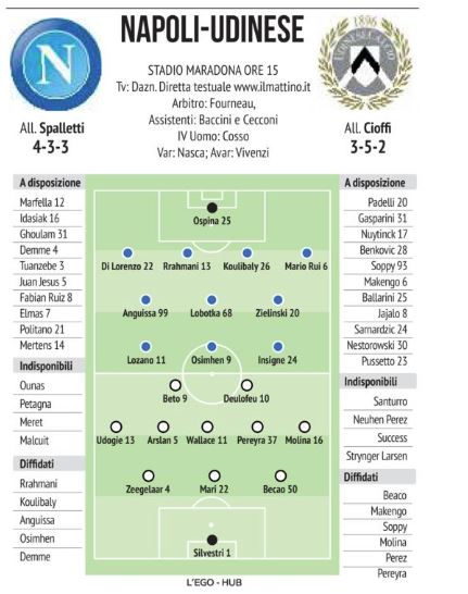 Nel primo pomeriggio al Maradona, in campo Napoli ed Udinese. Il match tra azzurri e bianconeri sarà quello che inaugurerà il sabato calcistico che vede in campo tutte e tre le squadre che al momento occupano i primi tre posti della classifica di serie A. Il Mattino ha provato a mettere gli undici di casa e ospiti in campo: