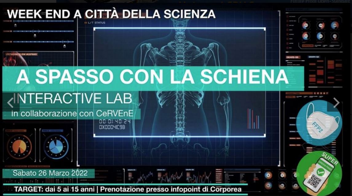Come sempre si potranno effettuare le visite guidate al Museo interattivo del Corpo Umano Corporea, alla Mostra Insetti & Co e ai tanti altri nuovi percorsi espositivi ed assistere agli straordinari spettacoli del Planetario. Anche questo weekend sarà possibile partecipare alle attività scientifiche realizzate con CeRVEnE Centro Regionale di Riferimento Veterinario per le emergenze non epidemiche che si focalizzeranno sull’importanza per i bimbi di avere una postura sana durante le attività di studio e di svago.
