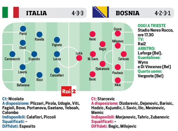 Dopo il pari di rimonta contro Montenegro, oggi pomeriggio al Nereo Rocco di Trieste, l’Italia Under 21 di Nicolato affronterà la Bosnia, con l’obiettivo di tornare al successo. All’andata vinsero gli azzurrini per 1-2. Il c.t. degli azzurrini punterà tutto sul tridente Cancellieri, Lucca e Vignato. Il classe 2000 Gianluca Gaetano partirà dalla panchina. Per gli ospiti sarà 4-2-3-1 con Lukic unica punta.