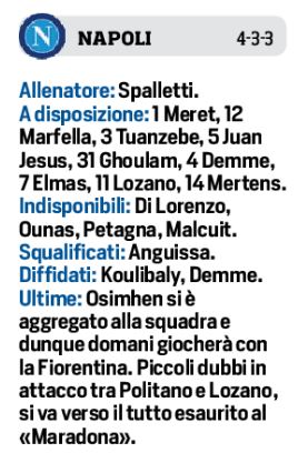 Domani al “Maradona”, fischio d’inizio alle ore 15,00, si giocherà la tanto attesa sfida Napoli-Fiorentina, dove per gli azzurri ci sono punti in palio per restare in scia allo scudetto. Per Spalletti c’è il recupero di Osimhen in attacco, anche se Mertens scalpita. Per il resto a destra ci sarà il bis del classe 2000 Zanoli, mentre a centrocampo Fabian al posto di Anguissa squalificato. Ballottaggio Politano-Lozano come esterno destro. In casa viola due i dubbi: a centrocampo Maleh o Duncan, mentre come esterno d’attacco Saponara-Ikonè.