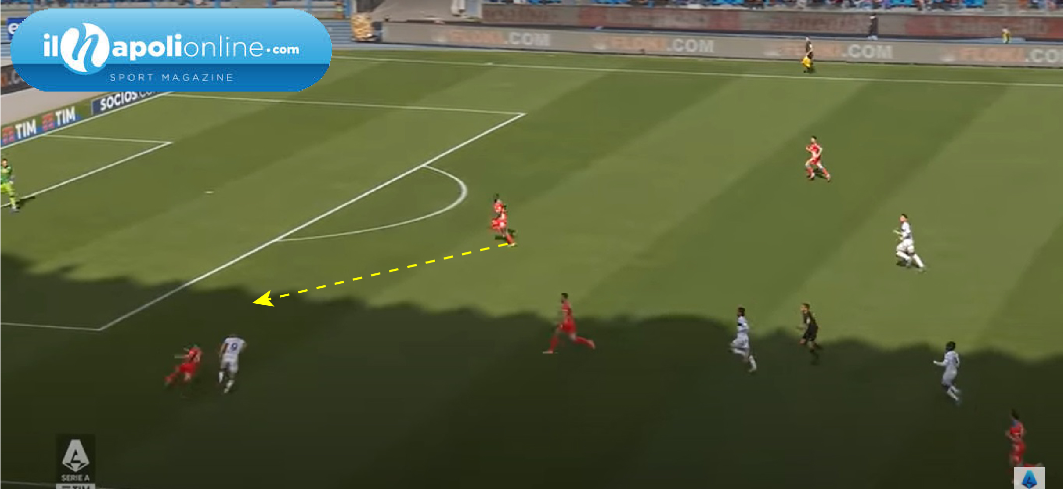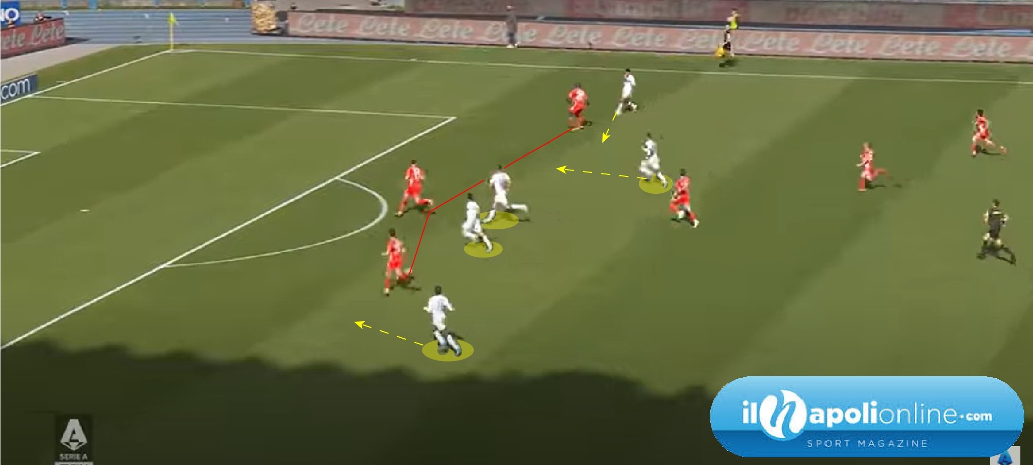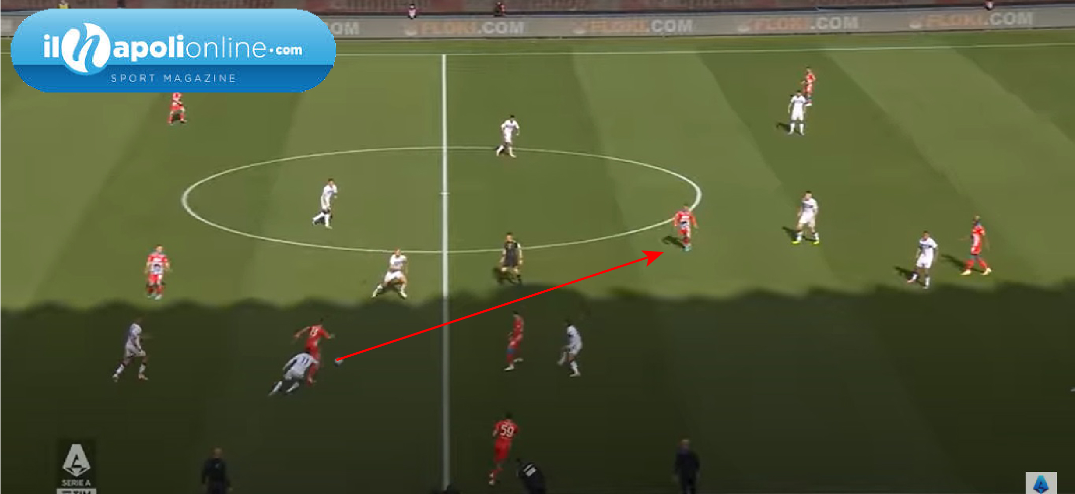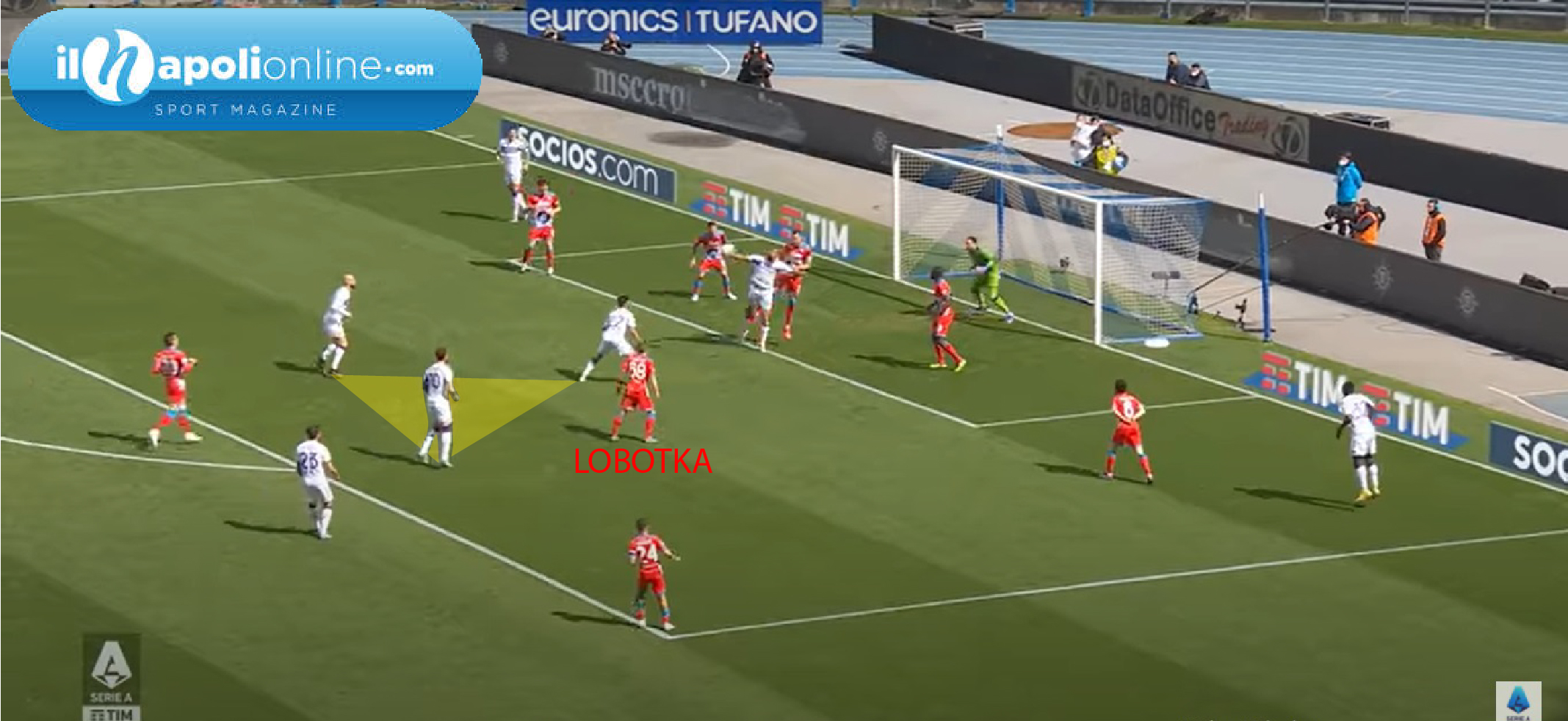 Vantaggio viola che arriva da un contropiede veloce, dove mister Italiano ha costruito le sue squadre; ma analizzando il goal subito si vede come il Napoli era abbastanza sbilanciato. Con solo tre uomini a formare la linea difensiva e ben 6 uomini ad attaccare la porta azzurra (figura 1). Sul seguito dell’azione la Fiorentina con un cross dalla sinistra fa finire la palla alla destra, che poi viene rimessa al centro. Ma in tutto questo tempo l’unico a recuperare la posizione è Politano che addirittura poi finirà sulla linea di porta sul tiro. Mentre Lobotka lì vicino non riesce a carpire l’uomo avversario più pericoloso; mentre Zielinski arriva addirittura al limite dell’area fermandosi e guardando l’azione (figura 2).
