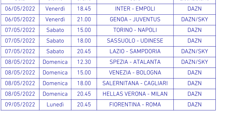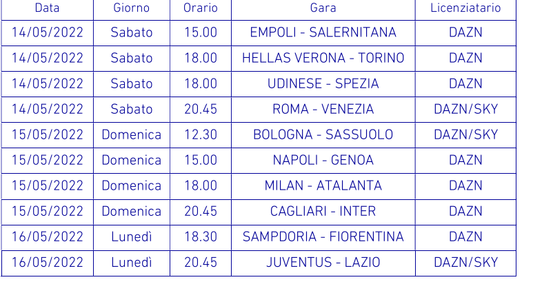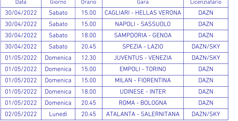 Il sito della Lega calcio, in serata, ha diramato gli anticipi e posticipi, compreso date e canali dove vederle, dalla trentacinquesima alla trentasettesima di campionato.