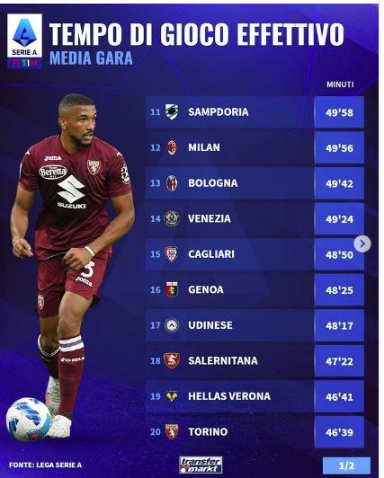 Bene, visto che gli azzurri sono nella Top10 del campionato attuale posizionandosi all’8° posto della speciale graduatoria. Il tempo di gioco effettivo di Koulibaly è compagni è di 50’32 per gara, appena dietro la Juventus (51’02) e la Fiorentina (51’05). In testa alla classifica c’è la Lazio di Maurizio Sarri con 54’32, davanti all’Empoli di Andreazzoli – prossima avversaria del Napoli – e all’Inter. Poi Atalanta e Sassuolo. Più giù, invece, la capolista Milan, con la squadra di Pioli che è attualmente al 12° posto (49’56). Fanalino di coda della classifica sono il Torino di Juric e l’ex squadra di Juric, il Verona. Fonte: Mattino.it