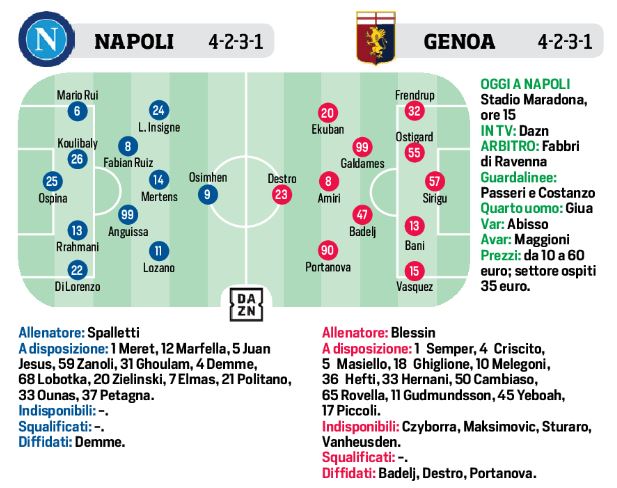 Questo pomeriggio al “Maradona”, fischio d’inizio alle ore 15,00, il Napoli affronterà il Genoa, sfida valevole per la penultima di campionato. Per Spalletti buone notizie dall’infermeria, tutti recuperati per la gara contro i liguri. In attacco spazio a Lozano, Mertens, Insigne e Osimhen. A centrocampo spazio ad Anguissa e Fabian Ruiz, Lobotka però scalpita. Infine Di Lorenzo è recuperato. Per i rossoblù due le assenze l’ex Maksimovic e a centrocampo Sturaro. In attacco ballottaggio Portanova-Yeboah, con il primo in vantaggio sul calciatore dell’Under 21. Infine Destro giocherà da centravanti.