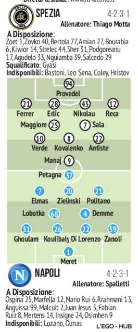 In attacco Petagna dal primo minuto, Osimhen entrerà a partita in corso. Dal primo minuto anche Politano a destra al posto dell’indisponibile Lozano, Elmas a sinistra con Insigne che partirà in panchina, Zielinski giocherà da trequartista. Un attacco, quindi, totalmente diverso rispetto alle ultime partite con quattro novità su quattro. E Mertens stavolta dovrebbe cominciare dalla panchina per trovare poi spazio durante il match contro lo Spezia.