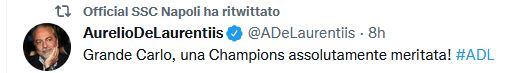 NewsCalcioRassegna Stampa De Laurentiis al vincitore della Champions: “Grande Carlo” By Giuseppe Sacco il Mag 29, 2022 - 08:20:53 0 Condividi Le parole social di De Laurentiis: Factory della Comunicazione “Grande Carlo, una Champions assolutamente meritata” AncelottiChampionsDe LaurentiisNapoli 0 Condividi FacebookTwitterGoogle+ReddItWhatsAppPinterestE-mail